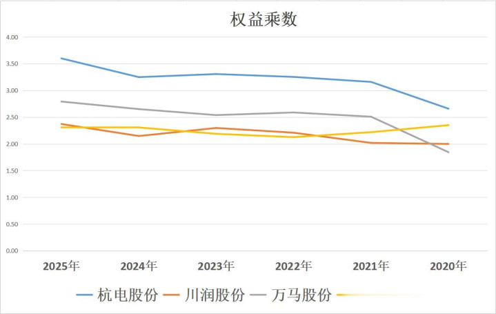 权益乘数:杭电股份>万马股份>川润股份>特变电工